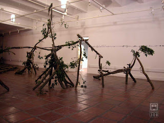 Madeira em estado bruto e barbante, sons e desenhos em carvão sobre papel - Coletivo 308 / 2009
